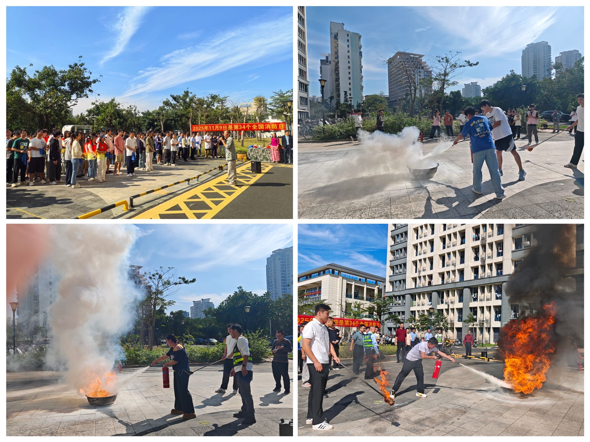 演练结束后,保卫处工作人员现场演示了干粉灭火器的“提、拔、握、压”四字操作要领,并指导师生轮流上场,亲身体验灭火实操。
